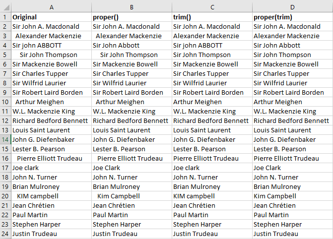 Note that “Sir john ABBOTT” is reformatted as “Sir John Abbott” and “KIM campbell” is reformatted as “Kim Campbell”. Next, we apply trim() function e.g. =trim(A2:A24)