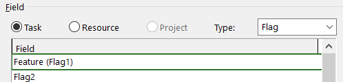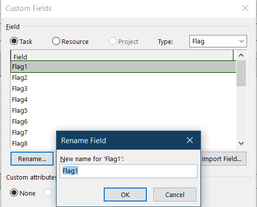 You should see a Custom Fields window. In this window, select the Type to be Flag. Choose Flag1 and click on Rename.
