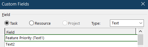 The choose Text for Type. Choose Text1 and rename it to Feature Priority. Click OK. You should see the following: